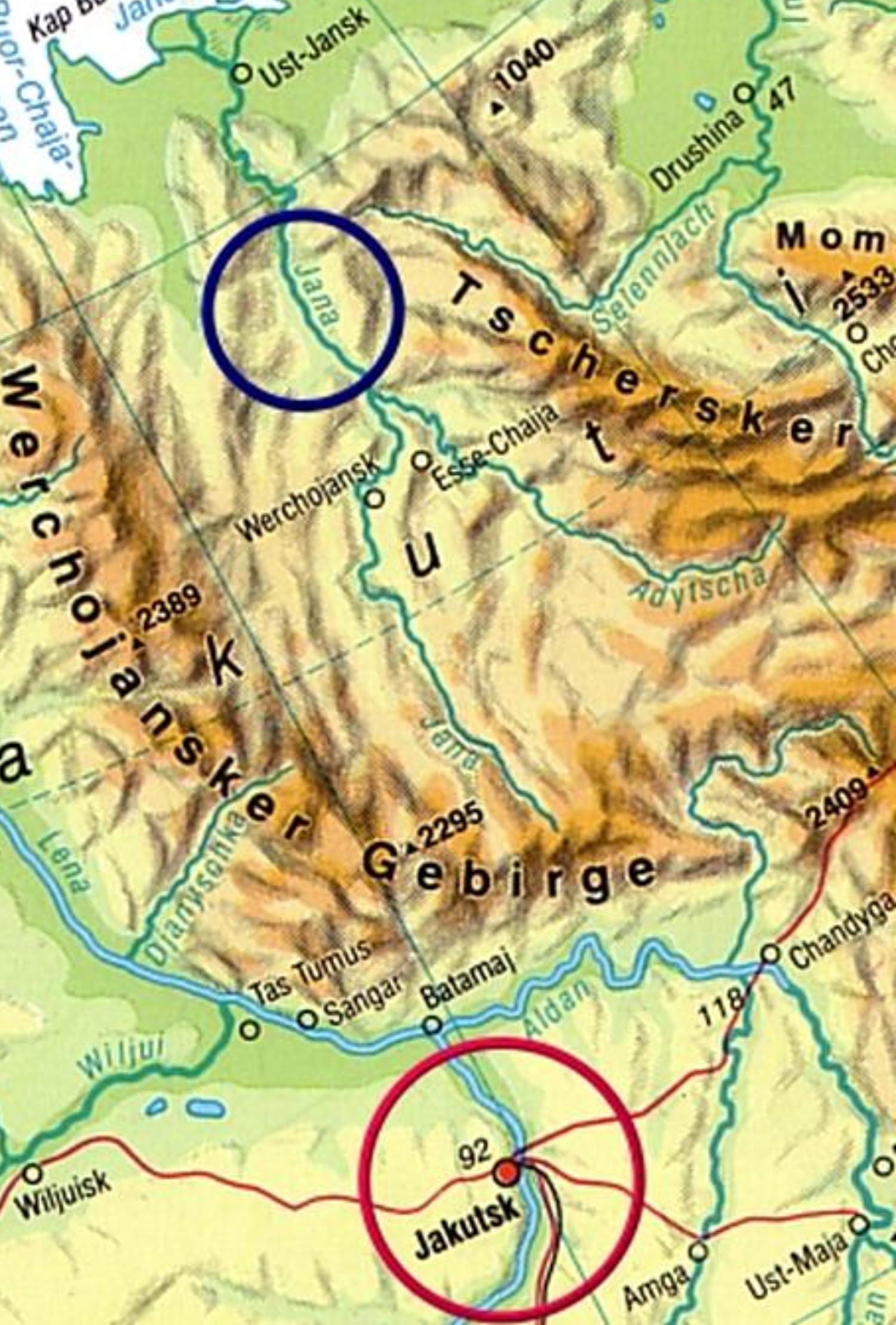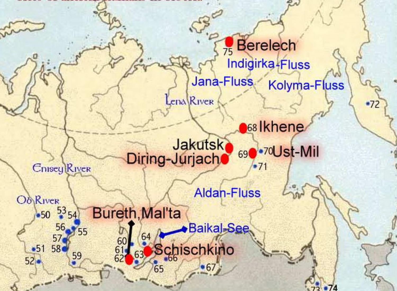 InderNähedesOrtesKazach`ye an der JanainderRepublikSacha (Jakutien)fandeinTeamResteeines Siedlungsplatzes.Derbei71Grad NordliegendePlatzwieshunderte SteinspitzenundeinigeVorderschäfte vonSpeerenauf,dieausRhinozeros-Horn und Mammut-Stoßzähnen hergestellt wurden.