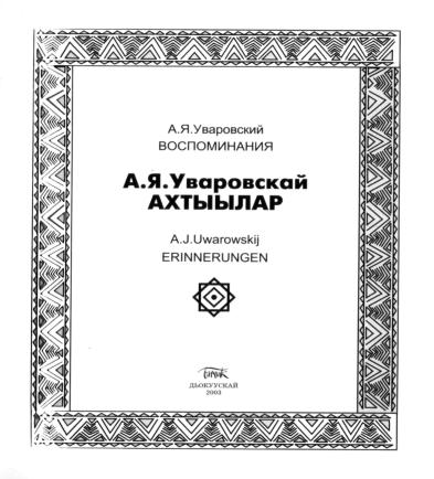 DasersteDenkmalderjakutischen Literatur>>Uwarowskij’s Erinnerungen<< wurde1848inderwissenschaftliche Arbeit vonO.N.Böhthlingk„ÜberdieSprache der Jakuten“ veröffentlicht.