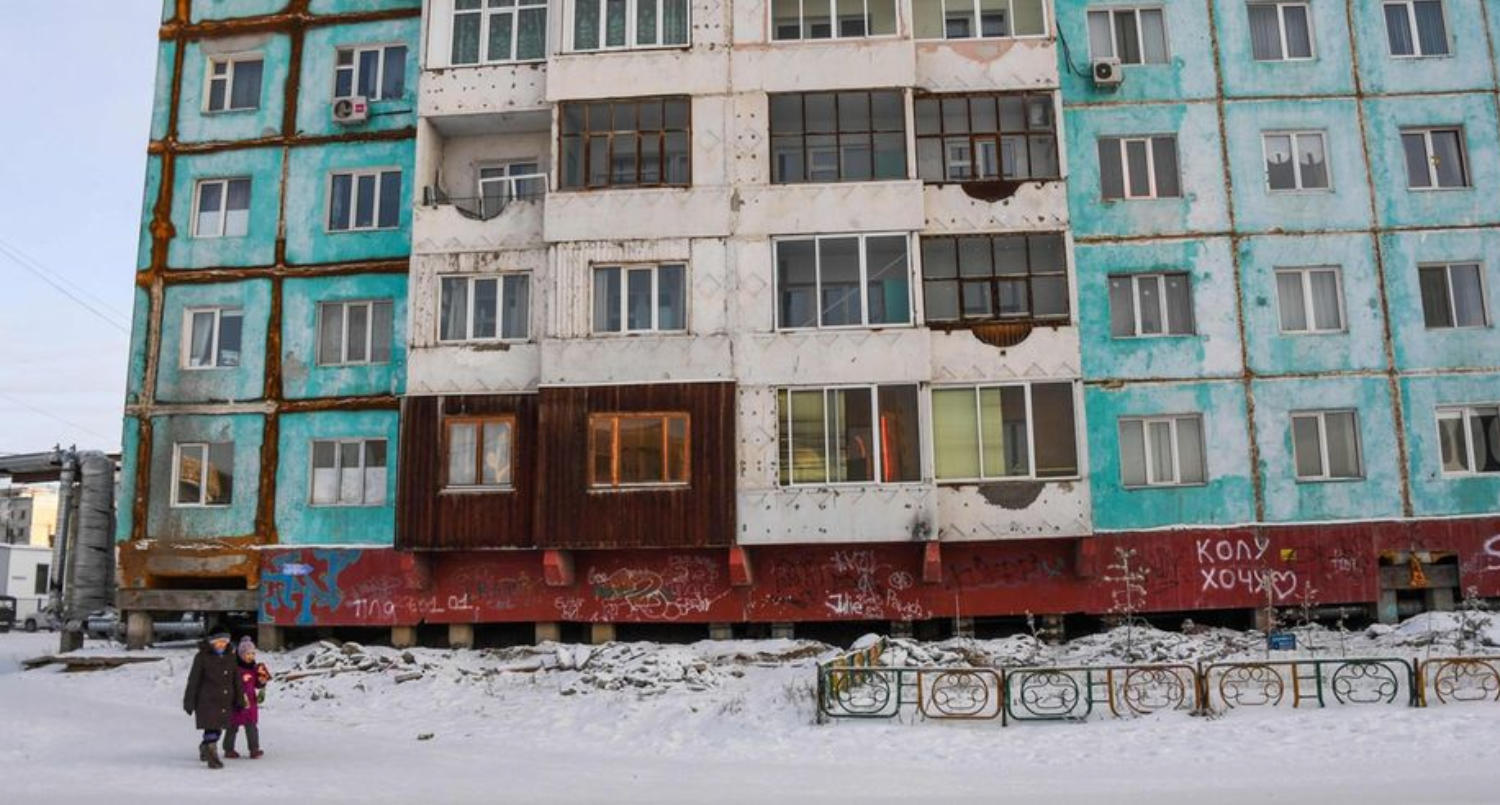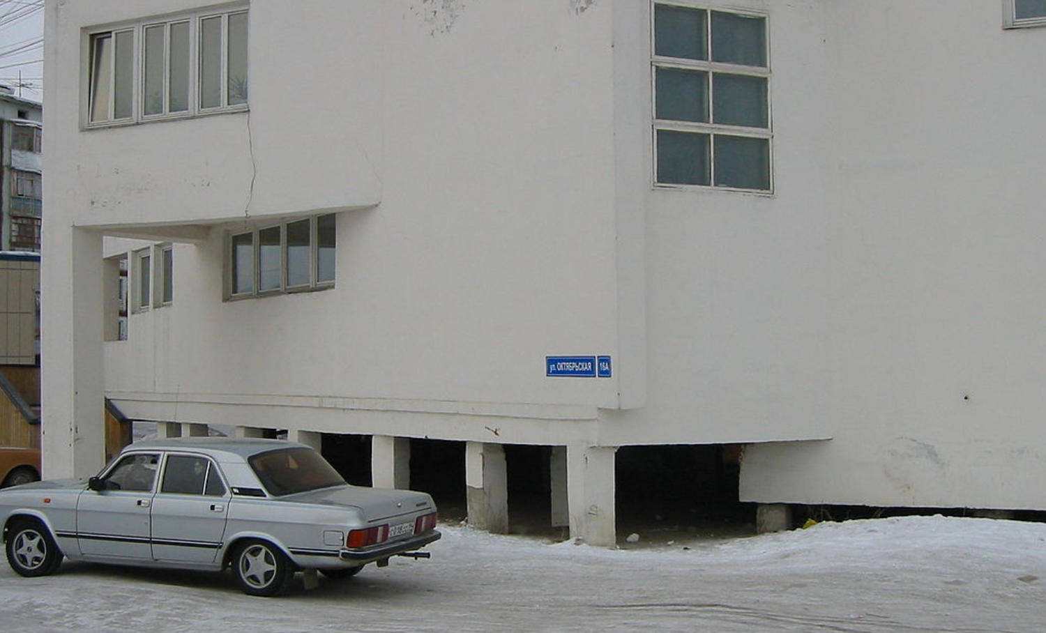 DochJakutskist einzige Großstadt, dieaufPermafrostbodenerbautist. JedesGebäudestehtaufPfählen,die tiefindenPermafrostbodenhinein-reichen.Damitverhindertmaneinen EinsturzderHäuser,wennsichdie EisschichtüberdieheißenMonate verringert,imWinteraberwieder ausbreitet.